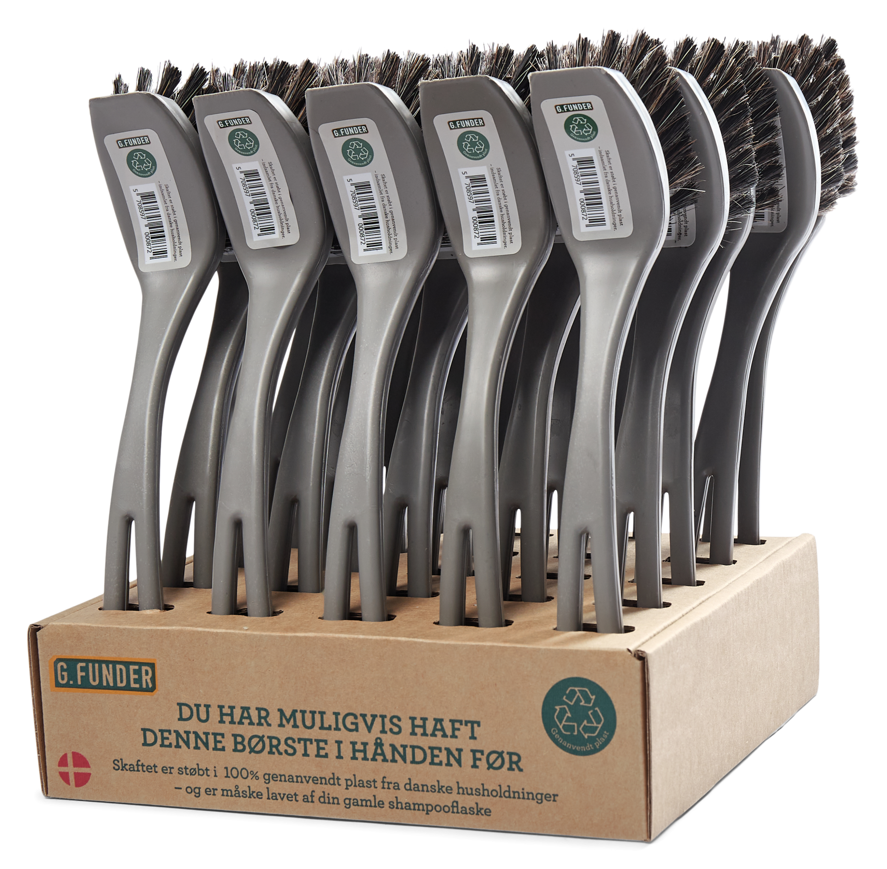 - Opvaskebørste med imiteret hår, skaft i dansk genanvendt plast (RPP) i display